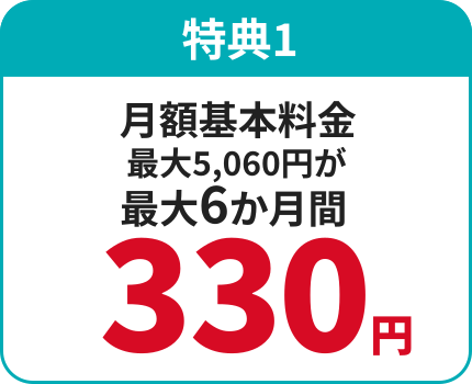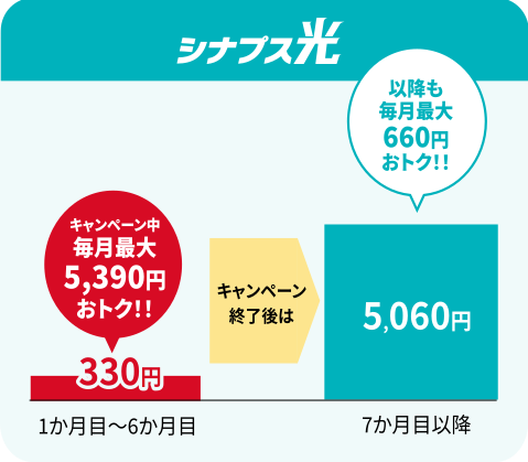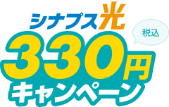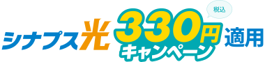 シナプス光の利用開始月を1か月目として、最大6か月目までのシナプス光とシナプスのインターネット接続サービスの月額基本料を割引して、税込330円で提供します。